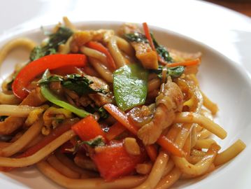 A hearty Japanese-inspired dish of thick wheat-based udon noodles stir-fried with mixed vegetables and your choice of protein, all tossed in a savory sauce.