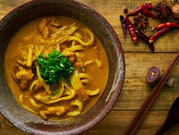 A comforting dish of thick wheat-based udon noodles in a flavorful curry sauce, made with a panang curry paste, mixed with mixed vegetables and your choice of protein, for a perfect balance of creamy and spicy flavors".